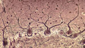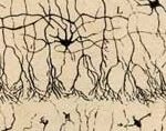 Purkinje cells are large inhibitory neurons with many branching dendrites, and are the principle neurons of the cerebellar cortex.